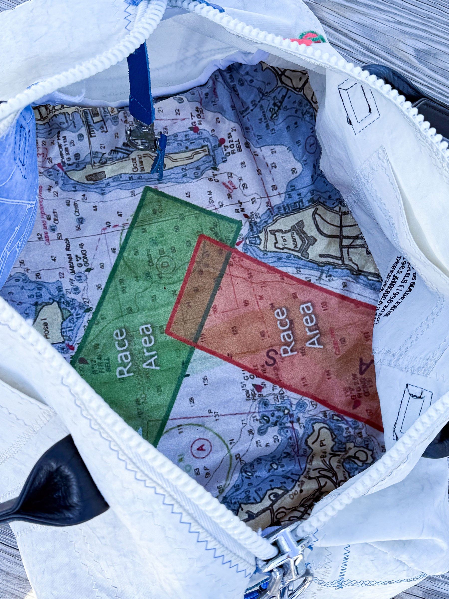 The lining of the bag shows the original race map for the 1962 Americas Cup off Newport Rhode Island
